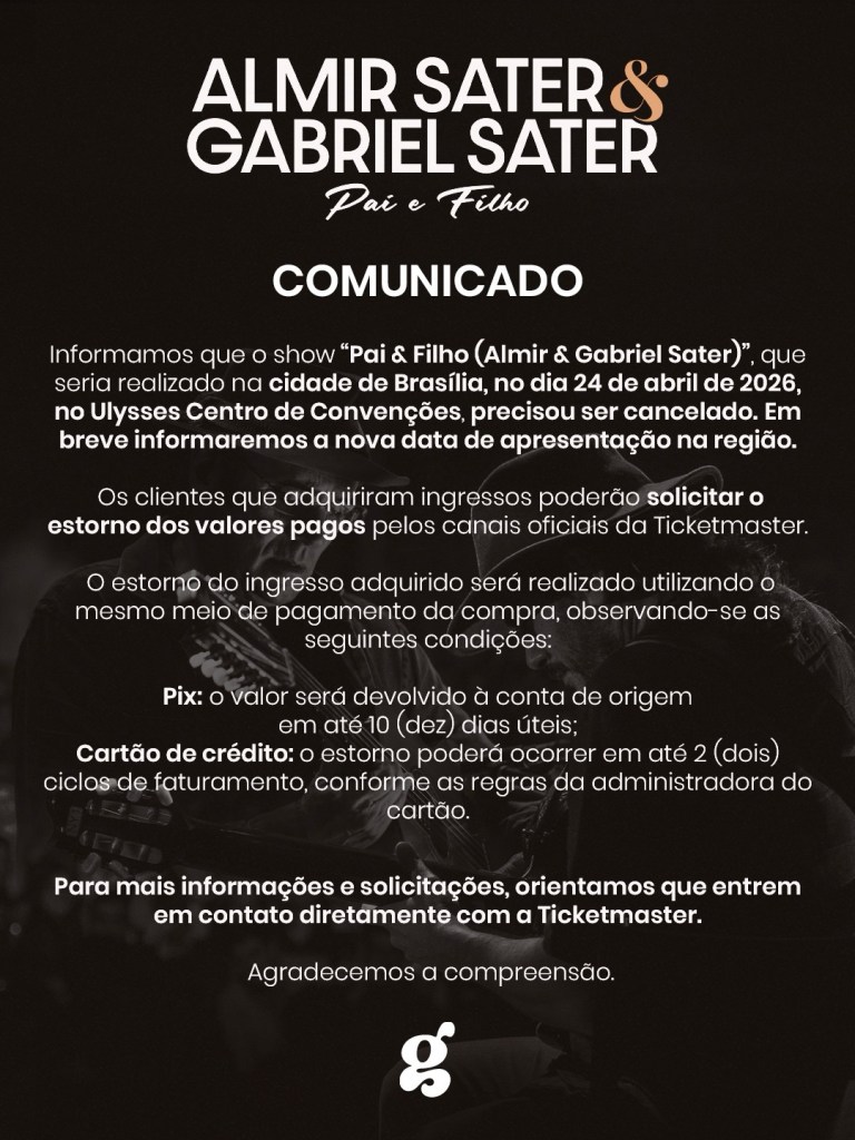Informamos que o show “Pai & Filho (Almir & Gabriel Sater)”, que seria realizado na cidade de Brasília, no dia 24 de abril de 2026, no Ulysses Centro de Convenções, precisou ser cancelado. Em breve informaremos a nova data de apresentação na região.