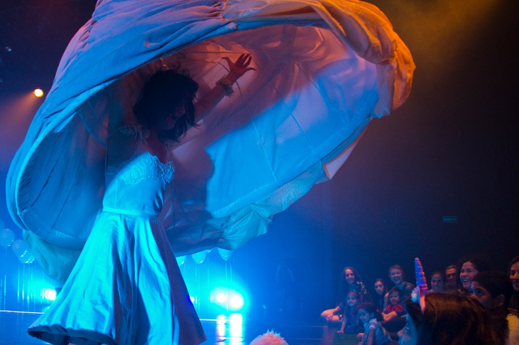 A Rainha éum espetáculo que nasce em 2015 e vem se transformando a cada ano e cada local que se apresenta. O espetáculo hoje é um trabalho pensado para a primeira infância que convida o público a adentrar o mundo onírico, mágico e efêmero das fábulas e contos maravilhoso. Vestida com grandes saias infláveis e flutuantes de onde as coisas surgem e somem, a Rainha se transforma o tempo todo. O público interage com ela através de experiências sensoriais no movimento, no toque, na escuta, através da sensibilidade dos sentidos. No palco, A Rainha bailarina divide a cena com músicas, figurinos, teatro de sombras, luzes e objetos que evocam, com graciosidade, as características de uma Rainha, fazendo uma celebração da natureza pela dança e pelo brincar, através da relação com o outro, com as flores, os cheiros, as cores a experiência tátil e sensível do mundo. A obra oferece uma oportunidade para vivenciar o mundo extraordinário e sensível das artes cênicas, pela ótica da primeira infância, que dialoga com afeto e empatia pelo mundo e pelo outro desde muito cedo.