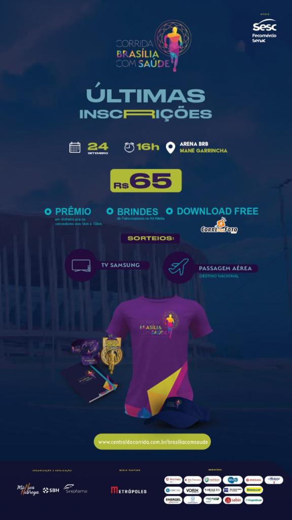 Entrada: R$ 65 – As inscrições estão abertas até o dia 20 de setembro no http://www.centraldacorrida.com.br/brasiliacomsaude
