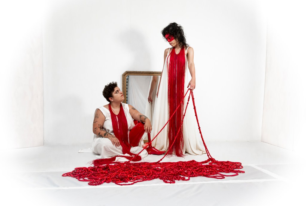As artistas propõem um mergulho nas suas existências, marcadas pela fissura, pela cicatriz, falas falhas, histórias, ancestralidades e deficiências. Um espelho e um fio vermelho são os elementos marcantes da instalação, um ambiente onírico, alvo, onde as duas artistas interagem e emaranhando-se nessa grande guia vermelha.