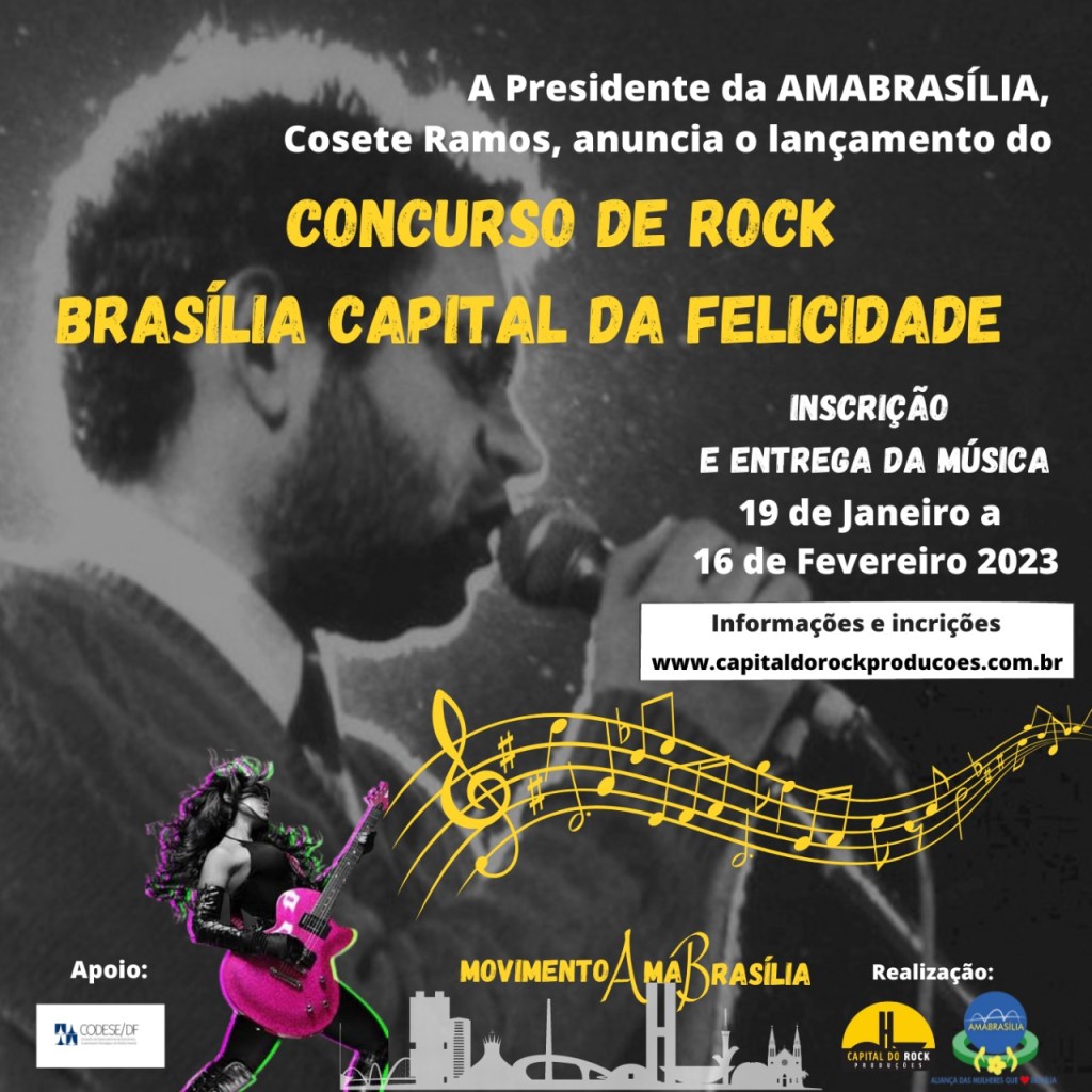 A Presidente da AMABRASÍLIA (Aliança das Mulheres que Amam Brasília), Cosete Ramos, idealizou e lança nesta quinta-feira, dia 19/02/2023, o Concurso de Rock – Brasília Capital da Felicidade