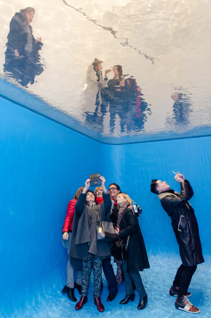 Uma das mais bem sucedidas experiências nesse sentido – que se tornou uma de suas obras mais populares e desconcertantes – é a “Swimming Pool” (piscina, em português). No CCBB Brasília ela será instalada no pavilhão de vidro. Atração onde quer que seja exposta, a piscina de Erlich provoca sensações absurdas tanto por quem entra nela – sem se molhar – quanto para quem está do lado de fora: uma camada de água entre um lado e outro cria a ilusão de que as pessoas ao fundo estão de fato mergulhadas numa piscina.