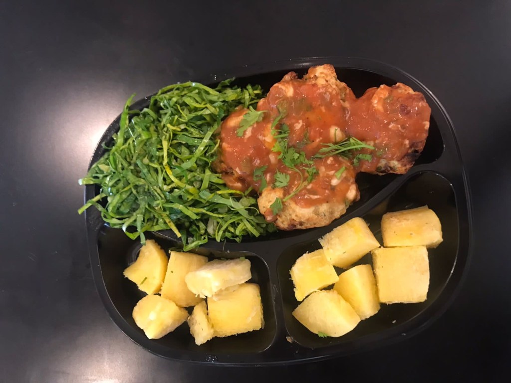 couve refogada; tilápia grelhada, farofa de banana da terra e