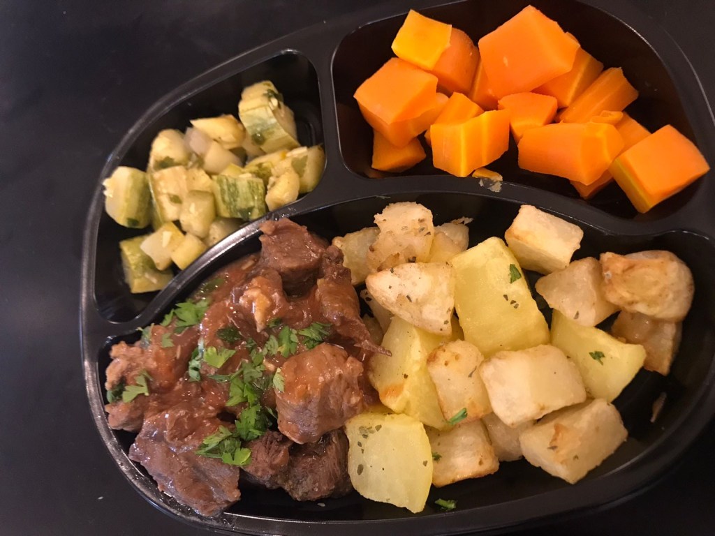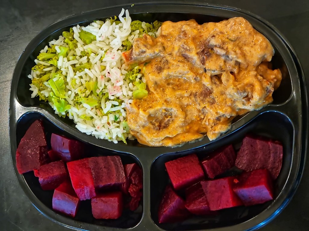 elas o estrogonofe de carne, arroz com brócolis e beterraba; carne de