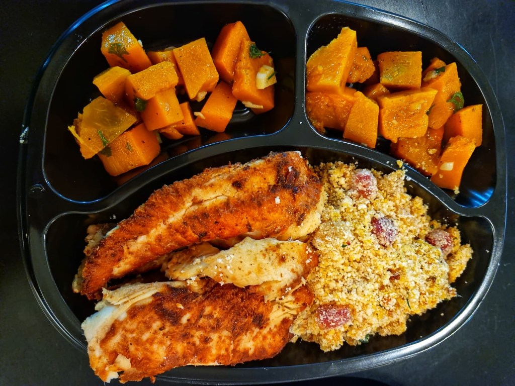 de batata doce e cenoura; almôndegas de frango, mandioca cozida e
