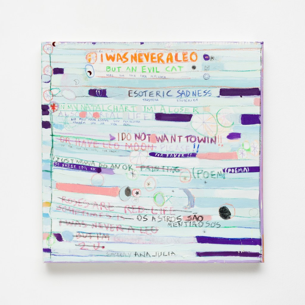 Nascida em Belo Horizonte (MG), Ana Júlia Vilela vive e trabalha em São Paulo (SP). Seu trabalho transita entre o gráfico e o pictórico e reelabora a linguagem instantânea das redes sociais em uma iconografia própria, repleta de formas fluidas e narrativas não lineares. O texto é elemento recorrente em suas pinturas, desenhos e gravuras, configurando crônicas do cotidiano que mesclam humor, cultura pop e autoficção. Graduada em Artes Visuais pela UFPel (Pelotas, 2018), foi premiada no 43º Salão de Arte de Ribeirão Preto (2018) e recebeu MençãoHonrosa na Bienal das ArtesSesc-DF (Brasília, 2018), entre outros. Realizou exposições individuais na Fundação Ecarta (Porto Alegre, 2021); Central Galeria (São Paulo, 2021); MARP (Ribeirão Preto, 2019); Museu Municipal Casa da Memória (Cajamar, 2012).