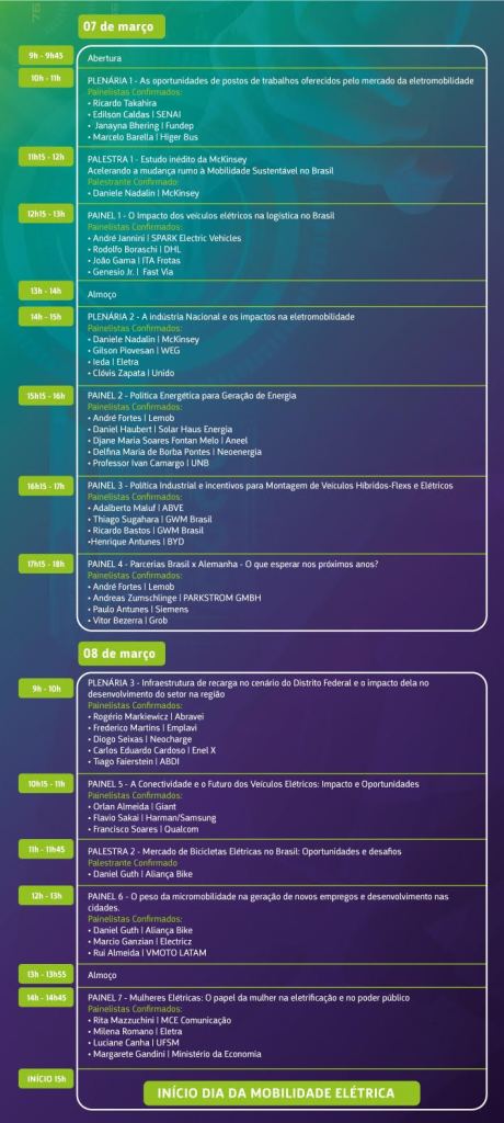 “Além disso, no dia 8, Dia Internacional da Mulher, teremos um painel com representantes mulheres na mobilidade elétrica, com a participação de Margarete Gandini, Coordenadora-Geral de Implementação e Fiscalização de Regimes Automotivo, do Ministério da Economia, entre outras executivas do setor privado”, completa Guggisberg.