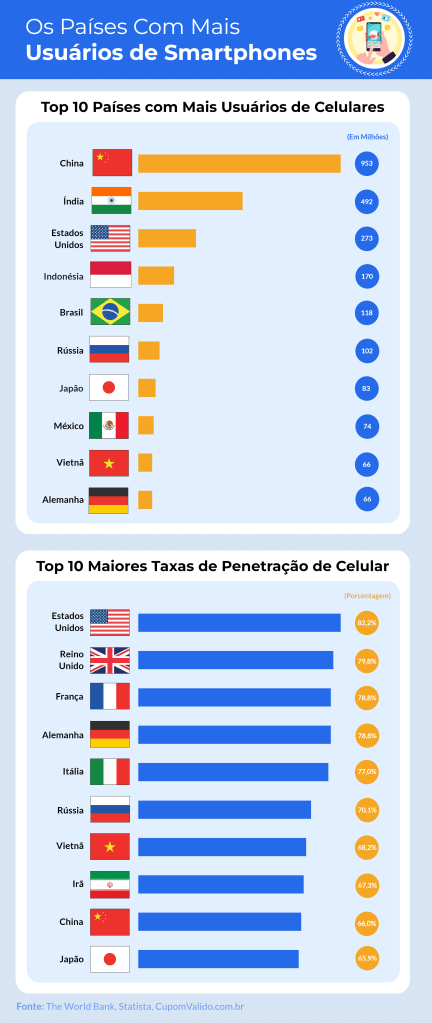 É o que revela um estudo divulgado pela plataforma de descontos CupomValido.com.br com dados da The World Bank e Statista sobre os smartphones no mundo.