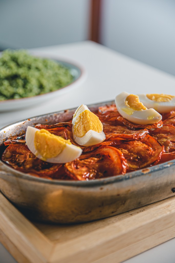 – Bacalhau em Postas Finas | R$ 192 – Bacalhau postas finas, sobre cama de batata, cebola, pimentão verde e azeitona preta. Coberto por tomates e levado ao forno com azeite extra Virgem. Ao final do preparo, acrescido de ovo cozido. Acompanha arroz branco ou com brócolis.