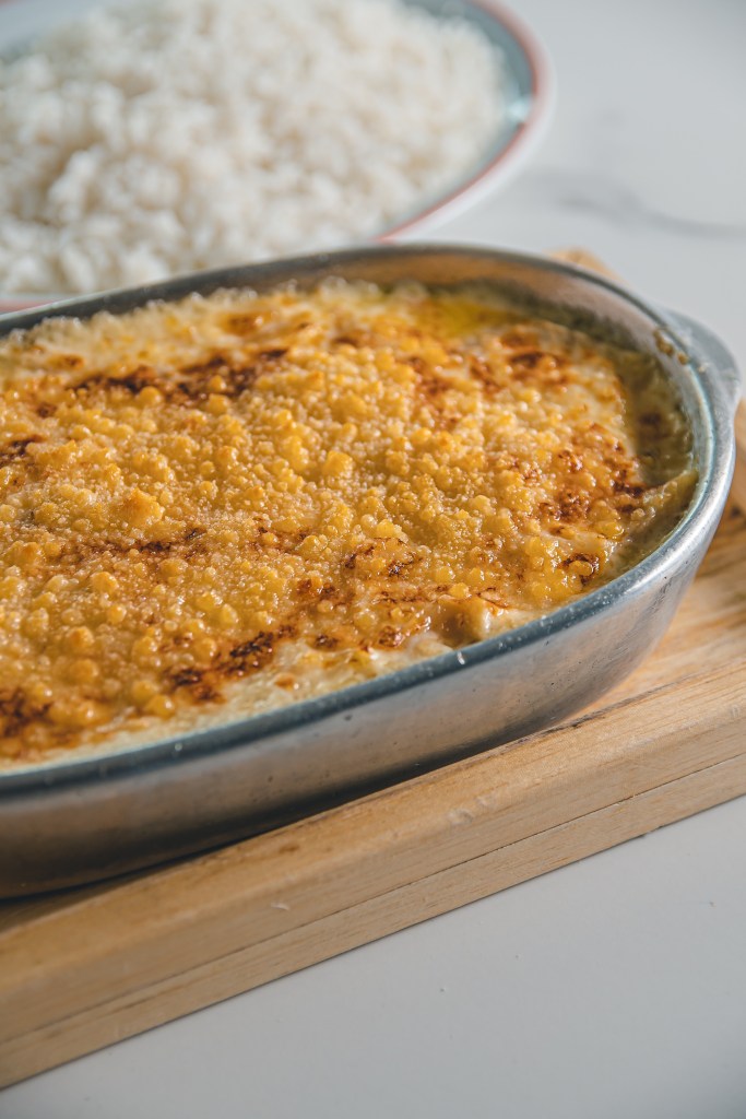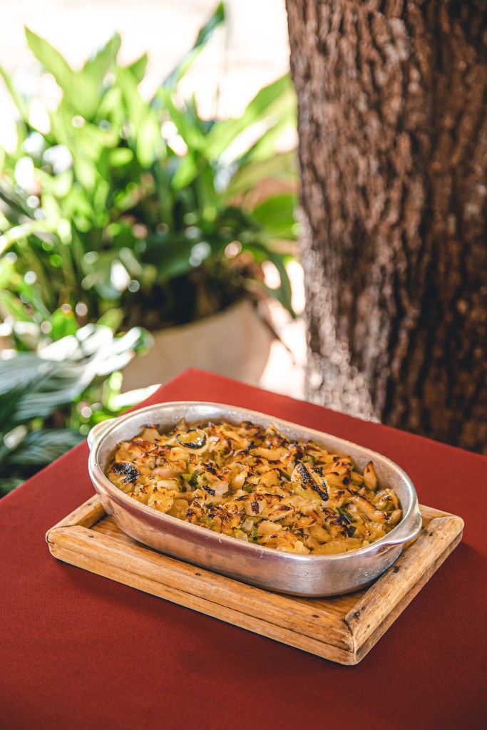 – Bacalhau em Natas | R$161 – Bacalhau em lascas refogado com nata frescas, cebola, alho e noz moscada. Depois é levado ao forno sobre cama fina de batatas e gratinado. Acompanha arroz branco ou com brócolis.