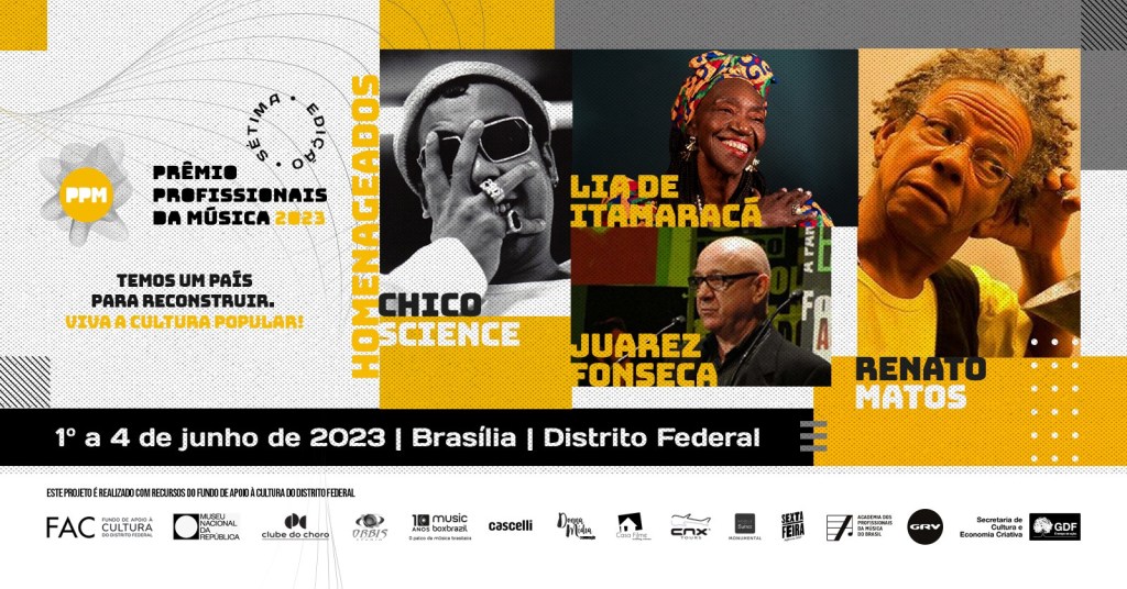 Ao slogan “Temos um país para reconstruir”, soma-se a urgência de expor e reconhecer o esforço de tantos nestes difíceis últimos anos. Portanto: “Viva a Cultura Popular”. Como uma das marcas do Prêmio Profissionais da Música (PPM) é a emoção sempre presente nas cerimônias de premiação, a organização trabalha, como de costume, para ir além da exposição e reconhecimento, no caso desta edição, de 176 categorias. De 1º a 4 de junho, a programação, que retorna ao formato presencial após a pandemia, traz inovações como o festival A Parada da Música, com destaque para as apresentações da cantora, compositora e cirandeira https://ppm.art.br/src/pages/conteudo.html?tipo=homenageadoeducacao e do compositor, cantor, instrumentista e artista plástico https://ppm.art.br/src/pages/conteudo.html?tipo=homenageadoconvergencia ,ambos homenageados pelo PPM 2022/2023. Além de Lia, representando a Modalidade Educação — criada a partir dessa edição–, e Renato, simbolizando Convergência, o evento homenageará, em Produção, o pesquisador e produtor musical https://ppm.art.br/src/pages/conteudo.html?tipo=homenageadoproducao e, em Criação, um dos expoentes do Mangue Beat, https://ppm.art.br/src/pages/conteudo.html?tipo=homenageadocriacao (in memoriam). Os ingressos limitados poderão ser retirados, gratuitamente, a partir de 12 de maio, no https://www.sympla.com.br/evento/premio-profissionais-da-musica-7-edicao/1972435?_gl=1*4e3gd8*_ga*MTcxOTQxNzE2LjE2NzQxNTY4MDg.*_ga_KXH10SQTZF*MTY4MzE0MDQzOC4xMC4xLjE2ODMxNDE5NzUuMC4wLjA.