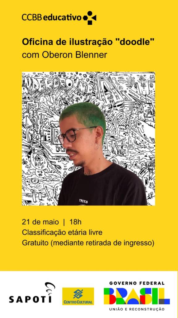 O artista Oberon Blenner, conhecido como Oberas, é o convidado do CCBB Educativo a conduzir oficina para criação de um painel realizado coletivamente com a técnica “doodle”, uma espécie de esboço ou desenho realizado ao acaso, normalmente imagens simples que podem ter significados concretos de representações ou formas abstratas. A atividade gratuita, que acontece dia 21/5, às 18h, no hall do 1o. Andar, no CCBB.