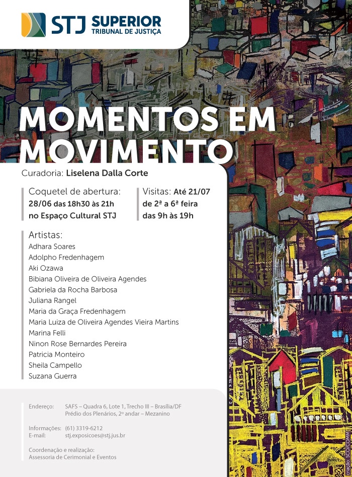 Acontecerá na Galeria do Espaço Cultural do STJ do dia 28 de junho ao dia 21 de julho de 2023, a Exposiçãocoletiva: MOMENTOS EM MOVIMENTO, com curadoria de Liselena Dalla Corte.