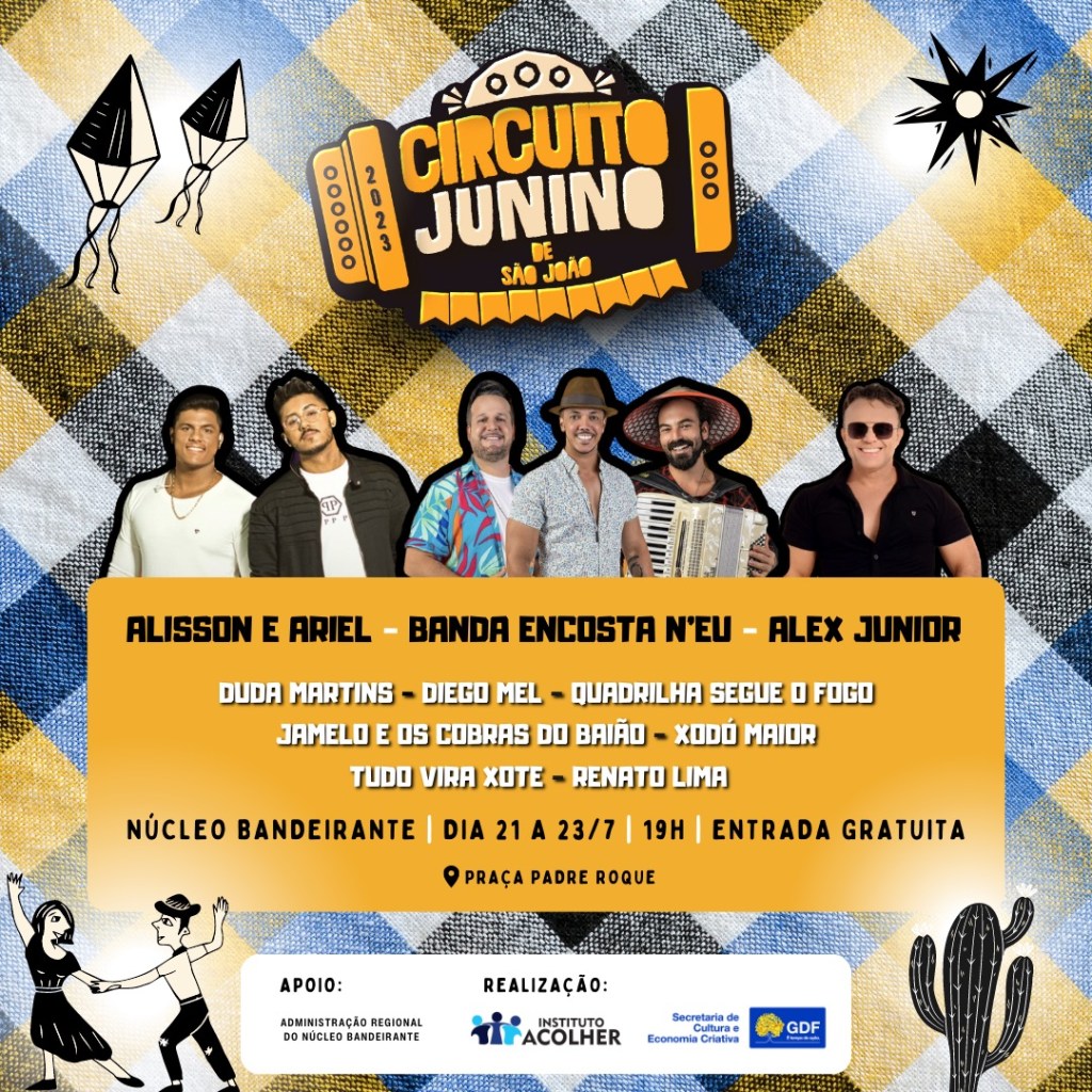 No dia 23 de julho, domingo, o Circuito Junino de São João se despedirá em grande estilo. Às 19h, Xodó Maior proporcionará um show emocionante, seguido, às 20h, por Tudo Vira Xote, com a energia contagiante de Thiago Frisson. Às 21h, a festa ficará ainda mais animada com o talentoso Renato Lima no