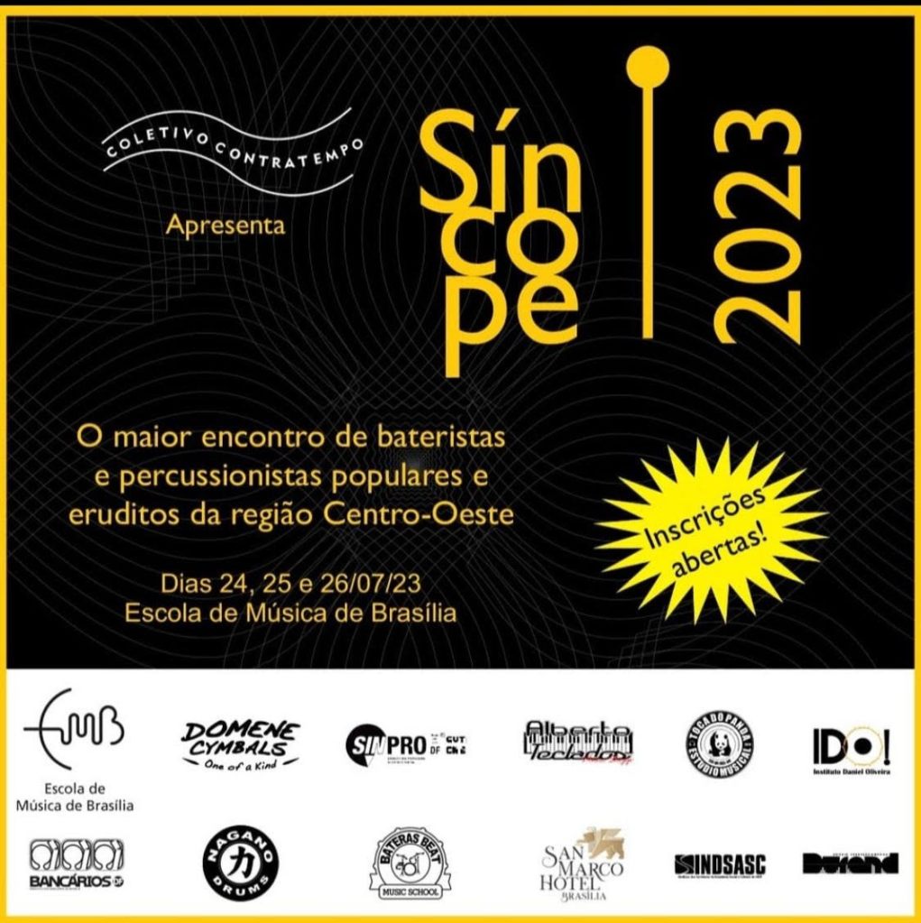 O cenário musical de Brasília se prepara para receber o Síncope 2023, o 2º Simpósio de Bateristas e Percussionistas da Região Centro-Oeste. O evento, realizado pelo Coletivo Contratempo, formado pelos bateristas Marcão Britto, Ticho Lavenère e Daniel Oliveira, acontecerá nos dias 24, 25 e 26 de julho, na Escola de Música de Brasília (CEP/EMB, 602 sul).