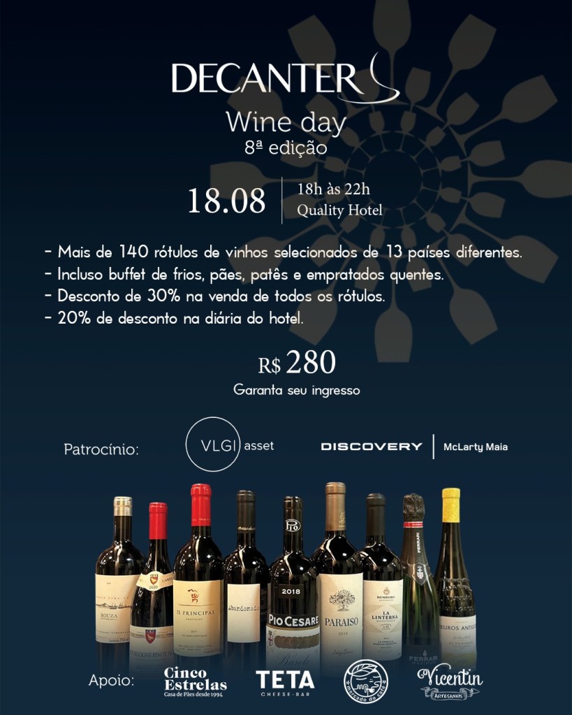 Os vinhos disponíveis no evento, reconhecidos e premiados internacionalmente, são exclusivos da Decanter. “A seleção para esta edição foi feita com muito critério, buscando uma ampla representatividade do nosso portfólio e incluindo várias linhas premium”, afirma o sommelier Luiz Otávio.
