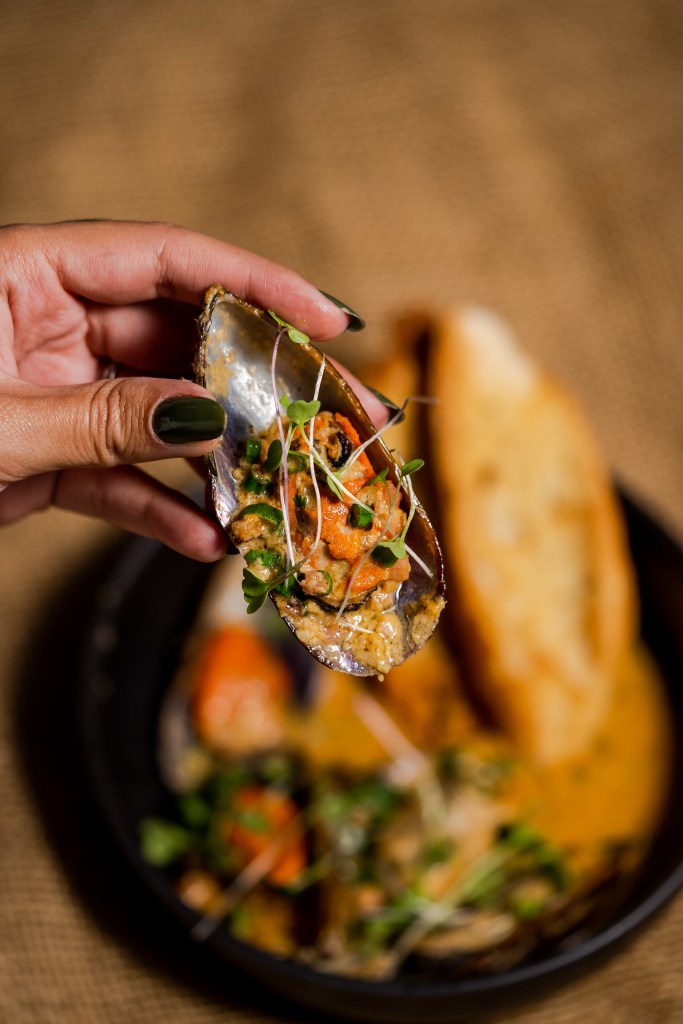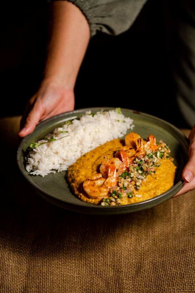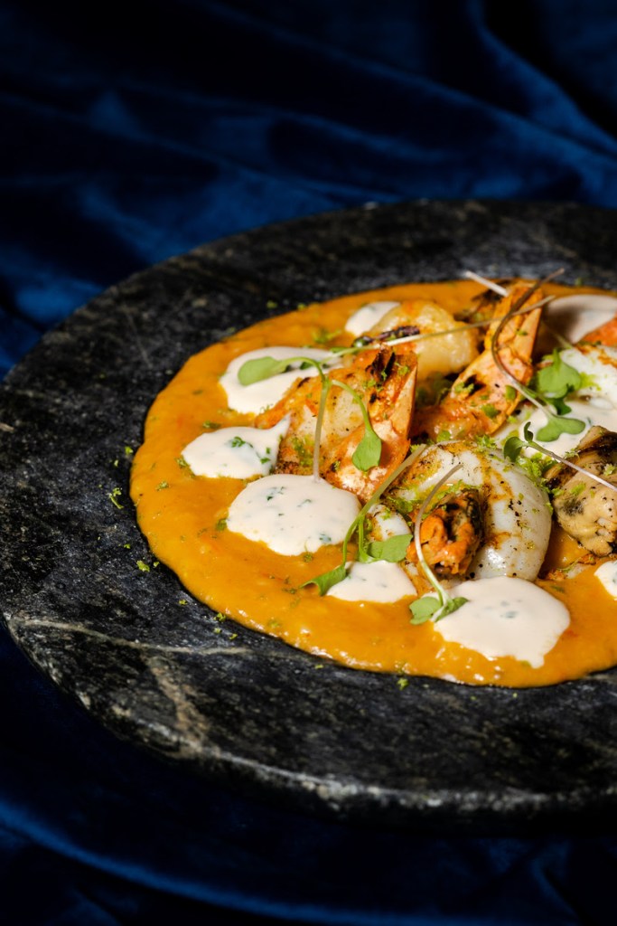 Os três pratos principais chegam com mais frutos do mar, como no Arroz Caldoso de frutos do mar com aioli de pimenta dedo de moça e a Massa negra com camarão no alho e óleo, mexilhões no vinho branco e raspas de limão siciliano. Quem prefere a carne vermelha pode optar pelo Ragú bovino com angú, agrião e palha de macaxeira.