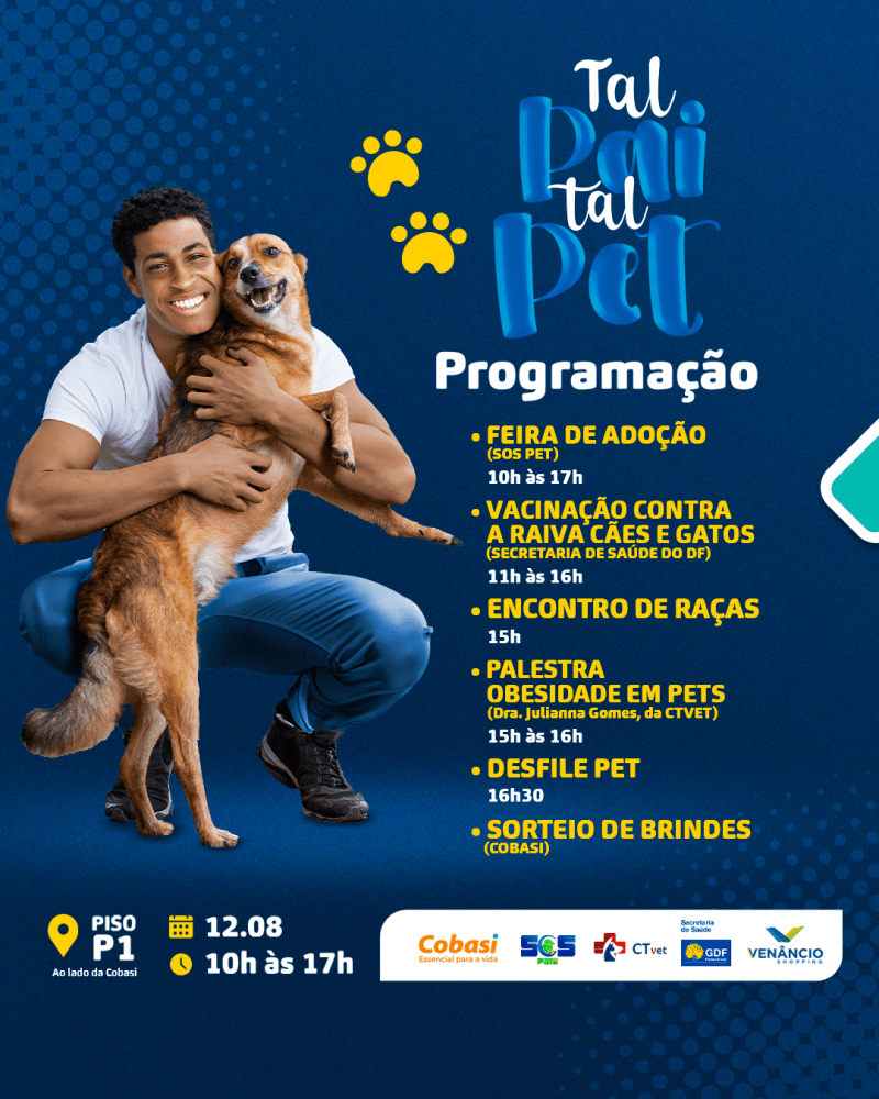 Neste sábado (12), o Venâncio Shopping celebra o Dia dos Pais com programação especial. Toda família pode se reunir e se divertir com as atividades oferecidas ao longo do dia, como: feira de adoção, vacinação antirrábica, encontro de raças, desfile pet, palestra sobre obesidade em animais, teatrinho infantil e um torneio de tênis de mesa.