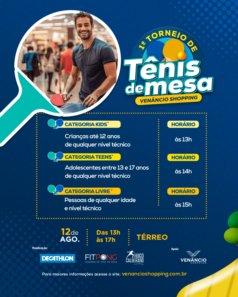 Inscrição 1º Torneio de Tênis de Mesa do Venâncio Shopping: basta preencher o formulário de inscrição neste link até às 18h do dia 11 de agosto. Confira o regulamento aqui