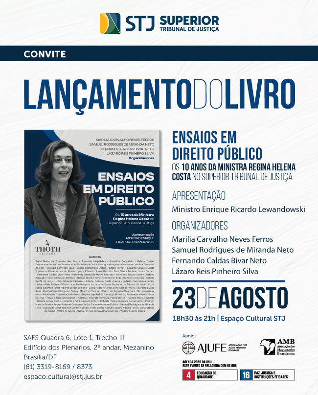 O Espaço Cultural do Superior Tribunal de Justiça (STJ) promove no dia 23 de agosto de 2023, das 18h30 às 21h, o lançamento do livro “ENSAIOS EM DIREITO PÚBLICO – OS 10 ANOS DA MINISTRA REGINA HELENA COSTA NO SUPERIOR TRIBUNAL DE JUSTIÇA”, organizado por Marilia Carvalho Neves Ferros, Samuel Rodrigues de Miranda Neto, Fernando Caldas Bivar Neto e Lázaro Reis Pinheiro da Silva. A obra possui a apresentação de autoria do Ministro Enrique Ricardo