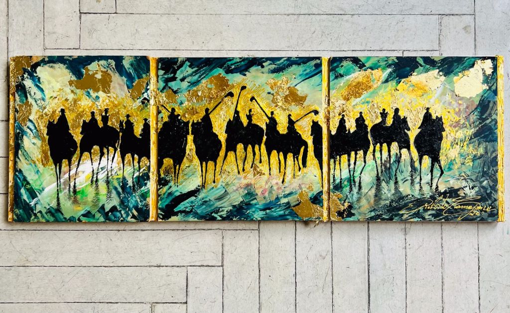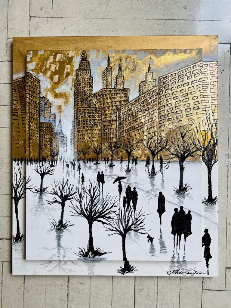 Roberto Camasmie uniu sofisticação e movimento nas obras de sua nova coleção “New York in Gold”. São artes, em perspectiva 3D, com figuras fluidas, silhuetas e sombras que apresentam o indivíduo em movimento para a luz. Criadas em folhas de ouro 24 quilates, que remetem o poder, o luxo e a riqueza que a cidade tem, levam ainda as cores preta e branco que se destacam e se conversam