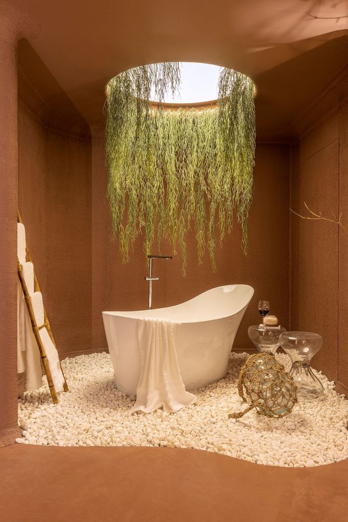 Indo além das tendências, as designers trouxeram para o espaço alguns elementos exclusivos e surpresas para os visitantes. Explorando bem as formas orgânicas e materiais diferenciados, um dos pontos altos do projeto é o espaço do closet, que será totalmente aberto e conceitual. “Teremos um cabideiro feito com um grande galho de árvore tratado que ficará suspenso. Os acessórios minimalistas serão dispostos em troncos de árvore.A sala de banho receberá uma claraboia de tela tensionada rodeada de vegetação pendente”, destaca Luciana Câmara.