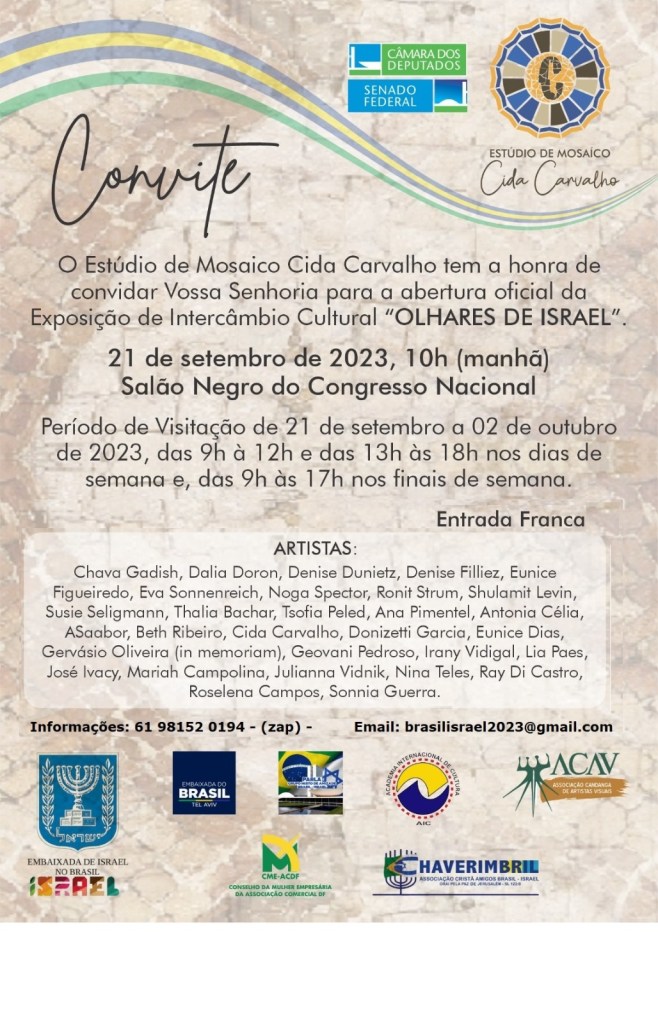 Para marcar a beleza do encontro entre Brasil e Israel, e o que surge dessa troca, o Estúdio de Mosaico Cida Carvalho, com a chancela da Embaixada de Israel no Brasil e o apoio do Congresso Nacional inauguram a exposição “Olhares de Israel”.