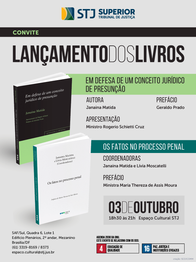 O Espaço Cultural do Superior Tribunal de Justiça (STJ) promove no dia 03 de outubro de 2023, das 18h30 às 21h, o lançamento dos livros “EM DEFESA DE UM CONCEITO JURÍDICO DE PRESUNÇÃO”, de autoria de Janaina Matida e apresentação do Ministro Rogerio Schietti Cruz do STJ e “OS FATOS NO PROCESSO PENAL”, coordenado por Janaina Matida e Lívia Moscatelli, com prefácio da Ministra