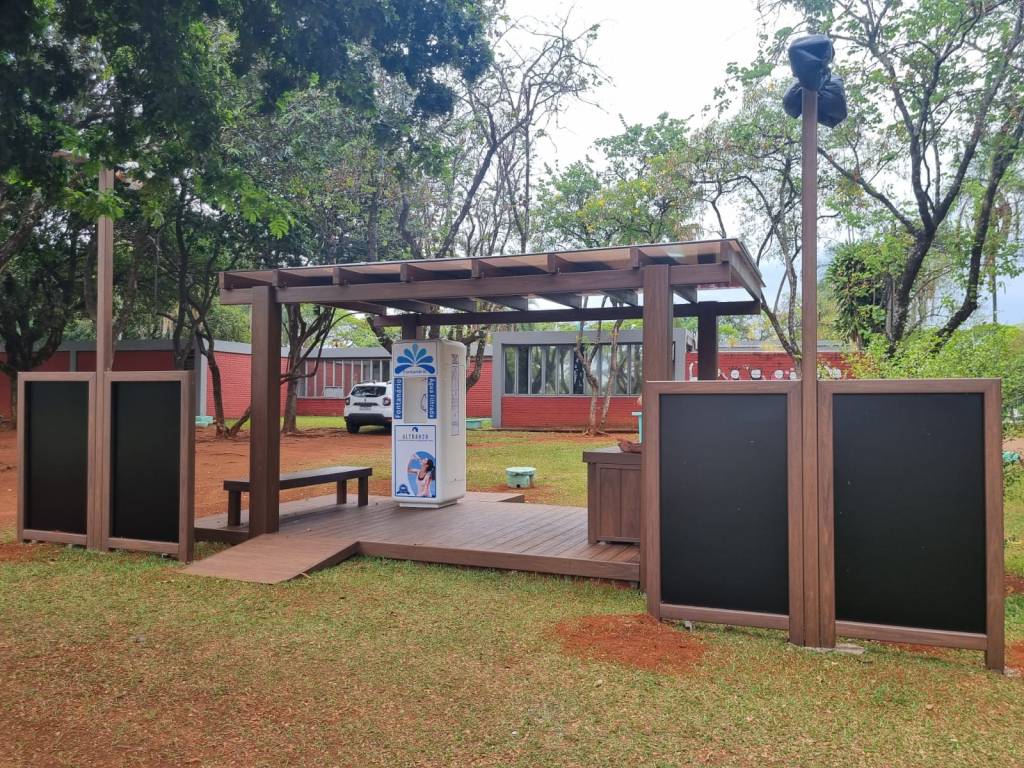 O espaço de convivência promove a interação social, propiciando espaço para descanso, energia gratuita, água potável, sociabilização e lazer, construídos sobre os pilares da sustentabilidade com a utilização de madeira plástica ecológica 100% reciclada