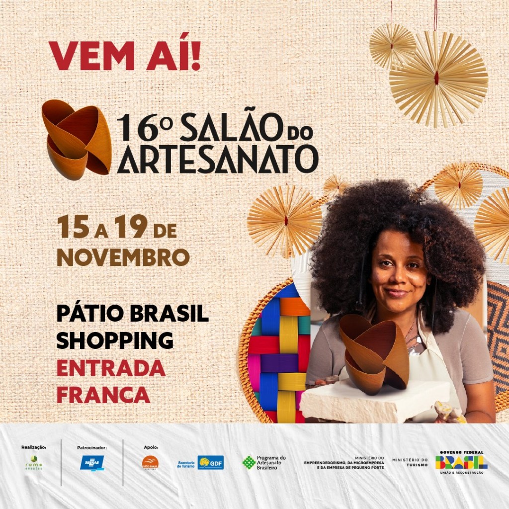 O artesanato, uma das preciosidades da cultura brasileira, será destaque em Brasília de 15 a 19 de novembro. Realizado pela Rome Eventos na área de exposição externa do Pátio Brasil Shopping, o 16º Salão do Artesanato é aberto ao público e receberá o talento de artesãos, cooperativas e coletivos de todas as regiões do país. O Salão do Artesanato é uma vitrine importante para quem vive dessa manifestação artística e um destino ainda mais interessante neste período de compras que antecede o Natal. O evento irá além da exposição e oferta de produtos que carregam a marca da manualidade, diversidade e tradição, proporcionando uma rica programação a expositores e visitantes, com oficinas e mestres artesãos fazendo sua arte ao vivo. Em 2023, do conceito à execução, a edição reforça o compromisso de fazer um evento verdadeiramente inclusivo, acessível e sustentável e conta com o apoio do Programa do Artesanato Brasileiro (PAB)/ Ministério do Empreendedorismo, da Microempresa e da Empresa de Pequeno Porte, Ministério do Turismo, Pátio Brasil Shopping, da Secretaria de Turismo do Governo do Distrito Federal e patrocínio do Sebrae
