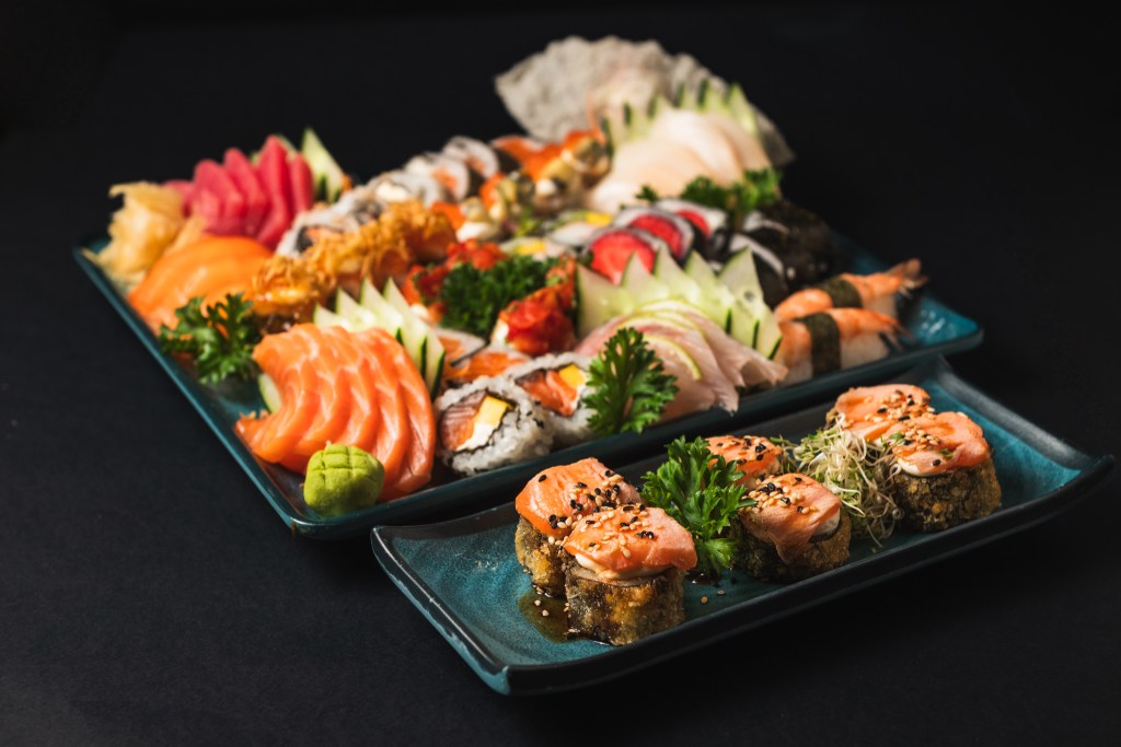 Para quem quer algo mais elaborado, o Combo Kosumosu é uma boa pedida. Ele inclui 6 sashimis de salmão, 6 sushis philadelphia, 6 sushis shakemaki, 6 sushis patê de salmão e teriyaki, 6 sushis de alho poró e cream cheese, 4 sushis tataki salmão, 6 sushi de oshizushi de salmão maçaricado e 2 niguiri de peixe branco. O preço é de R$139,90.
