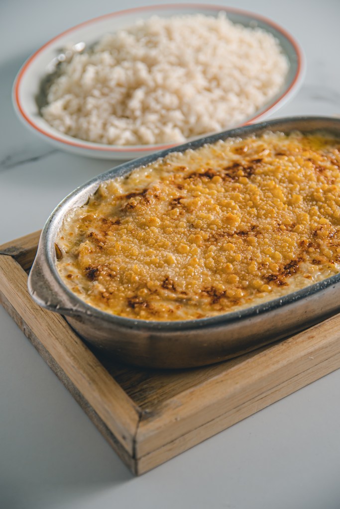 Bacalhau de natas- lascas de bacalhau preparadas com nata fresca. Finalizado ao forno sobre cama de batatas e gratinado com queijo parmesão.