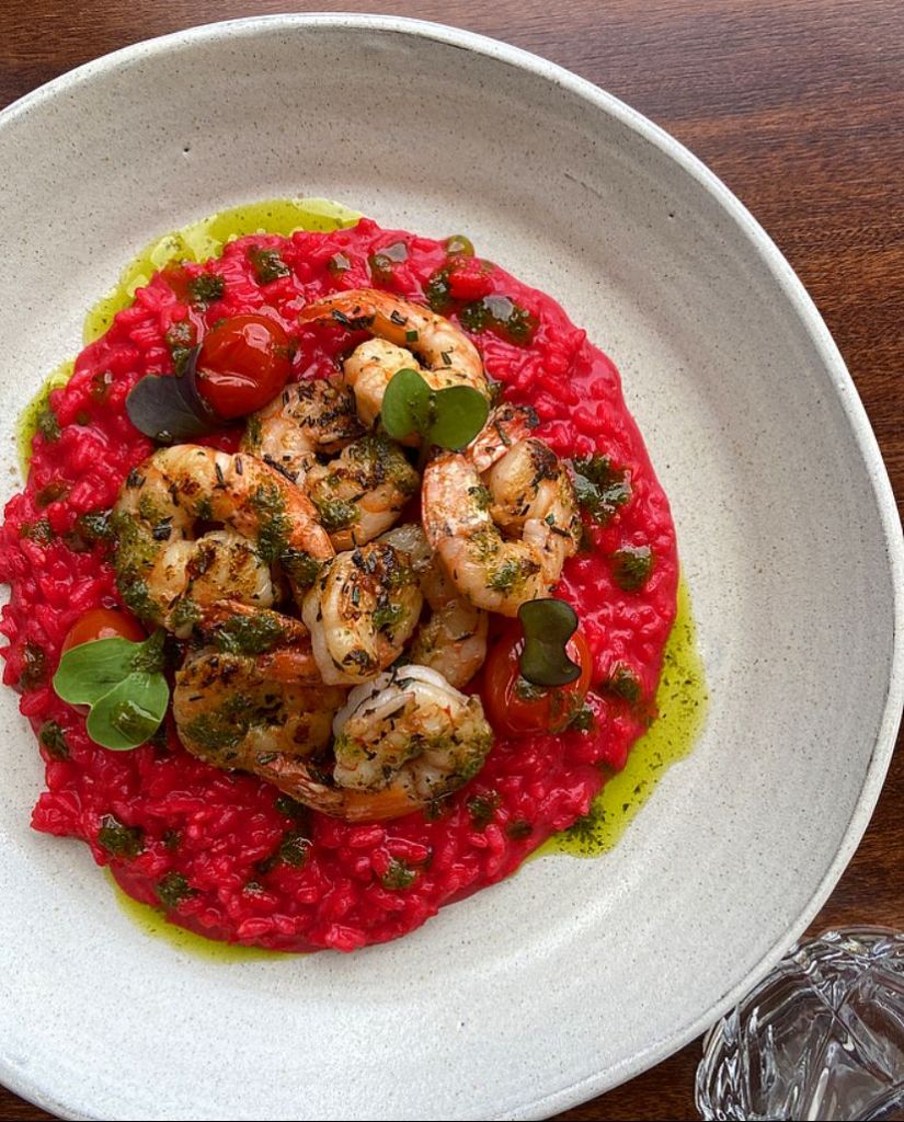Na quarta, Risotto Alla Barbabietola con Gamberi – Clássico risoto de beterraba com camarões salteados e brotos de rúcula.