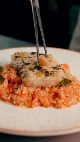 – Pesce Confit – Pescada amarela confitada com alho, ervas e azeite acompanhada de arroz cremoso de tomate defumado e crispy de manjericão;