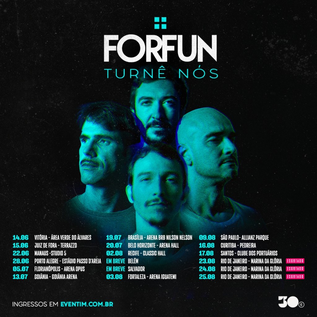 Assim que anunciou o retorno aos palcos, o Forfun divulgou datas de shows em São Paulo e no Rio de Janeiro – ambas concorridíssimas (só na capital fluminense, 40.000 ingressos esgotaram de prontidão). Agora, chegou a hora de novas praças serem confirmadas como destino da turnê NÓS. São 14 novas datas por todo o Brasil. A tour, inclusive, terá sua estreia marcada para o dia 14 de junho, na Área Verde do Álvares, em Vitória (Espírito Santo). Idealizada pela 30e, a tour se estende até 30 novembro, quando o grupo encerra a sequência de apresentações no Engenhão, no Rio de Janeiro. A venda de ingressos começa amanhã, dia 16 de janeiro, a partir do meio-dia, na Eventim