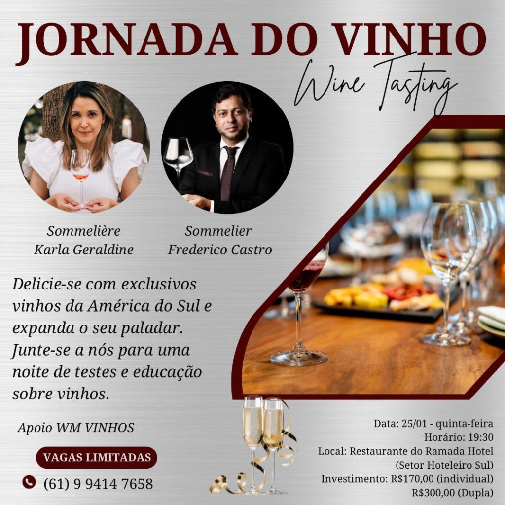 Venha aprender com os melhores: degustação guiada de exclusivos vinhos da América do Sul com os Sommeliers Frederico Castro (WSET, ABS, degustador avançado) e Karla Geraldine (WSET, Sommelier School) com mesa de frios, pães e antepastos. Será 25/01/2024, quinta-feira, às 19:30, no belíssimo restaurante do Ramada Hotel, no Setor Hoteleiro Sul de Brasília. Apoio WM Vinhos.