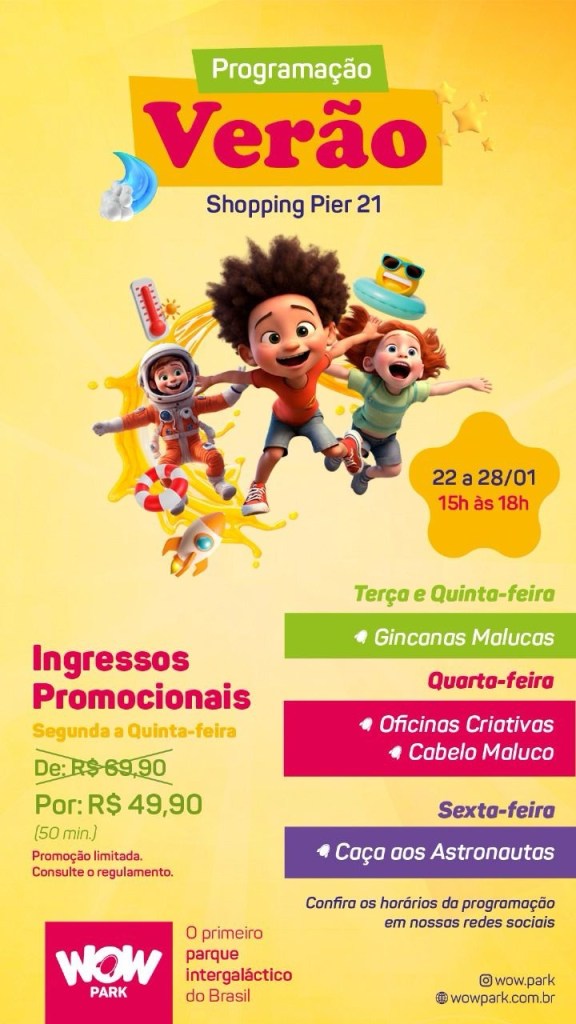 O Wow Park, localizado no Píer 21, preparou uma semana imperdível para encerrar as férias de janeiro em grande estilo. Com uma programação diversificada de 22 a 28 de janeiro, o parque promete animar crianças, jovens e adultos com atividades emocionantes e descontos especiais.