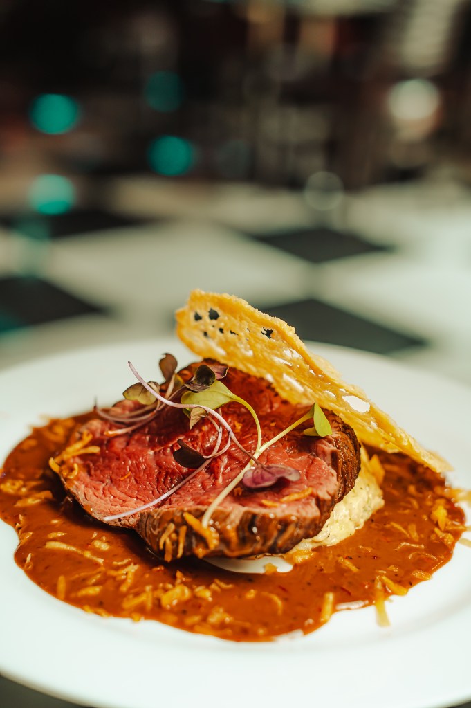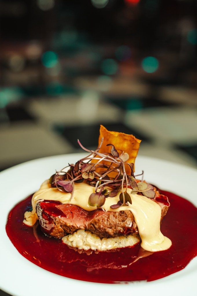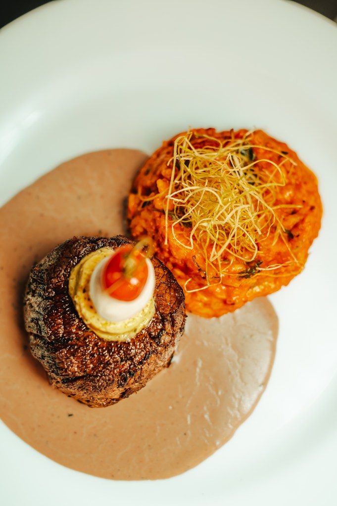 FILÉ UNIVERSAL – Filé mignon alto com manteiga de ervas Universal e mozzarella de búfala ao molho do própria carne e vinho tinto, servido com risoto de tomate seco caseiro por R$ 134;
