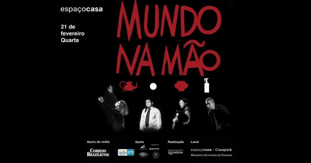 O espetáculo musical “Mundo na Mão”, idealizado e dirigido por Roger Mello, com atuação de Ariadna Moreira, Larissa Lopes, Roger Mello e o maestro e multi-instrumentista Tibor Fittel, terá apresentação única no palco do Teatro Espaço Casa, no Casa Park no dia 21 de fevereiro.