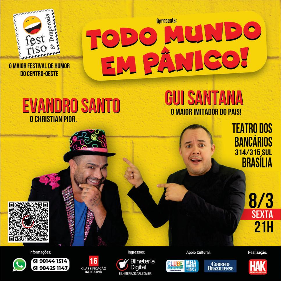 E como celebração de retomada das atividades, o “padrinho e recordista de sessões do Festival” EVANDRO SANTO (Christian Pior), acompanhado de GUI SANTANA (o maior imitador do Brasil), apresentarão o espetáculo TODO MUNDO EM PÂNICO, com abertura do comediante brasiliense Raphael da Matta, dia 08 de março (sexta feira), às 21h, no TEATRO DOS BANCÁRIOS (314/315 sul), com ingressos à venda pelo site bilheteriadigital.com.br.