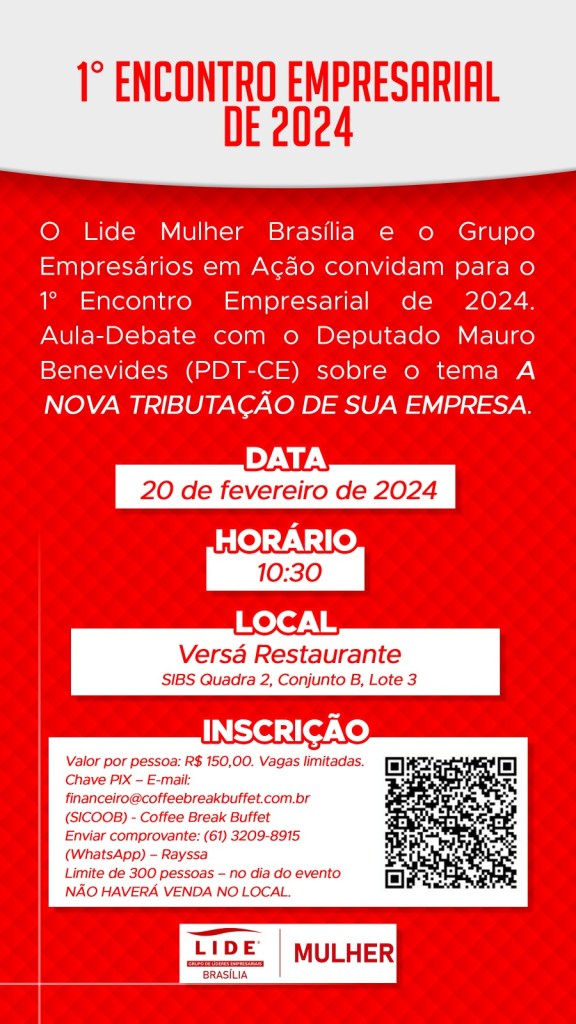 Na próxima terça-feira (20), o Versá Restaurante será palco do 1º Encontro Empresarial de 2024, promovido pelo Lide Mulher Brasília em parceria com o Grupo Empresários em Ação. O evento que já é destaque no cenário empresarial da capital, contará com a participação de Janine Brito, CEO da Pinheiro Ferragens e Presidente do Lide Mulher Brasília, além de líderes sindicais e empresários de diversos segmentos.