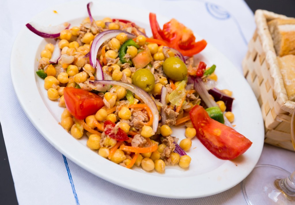Tempere o grão-de-bico com o azeite e o sal. Misture os demais ingredientes delicadamente, finalizando com a salsinha picada. Deixe na geladeira por pelo menos 1 hora antes de servir.