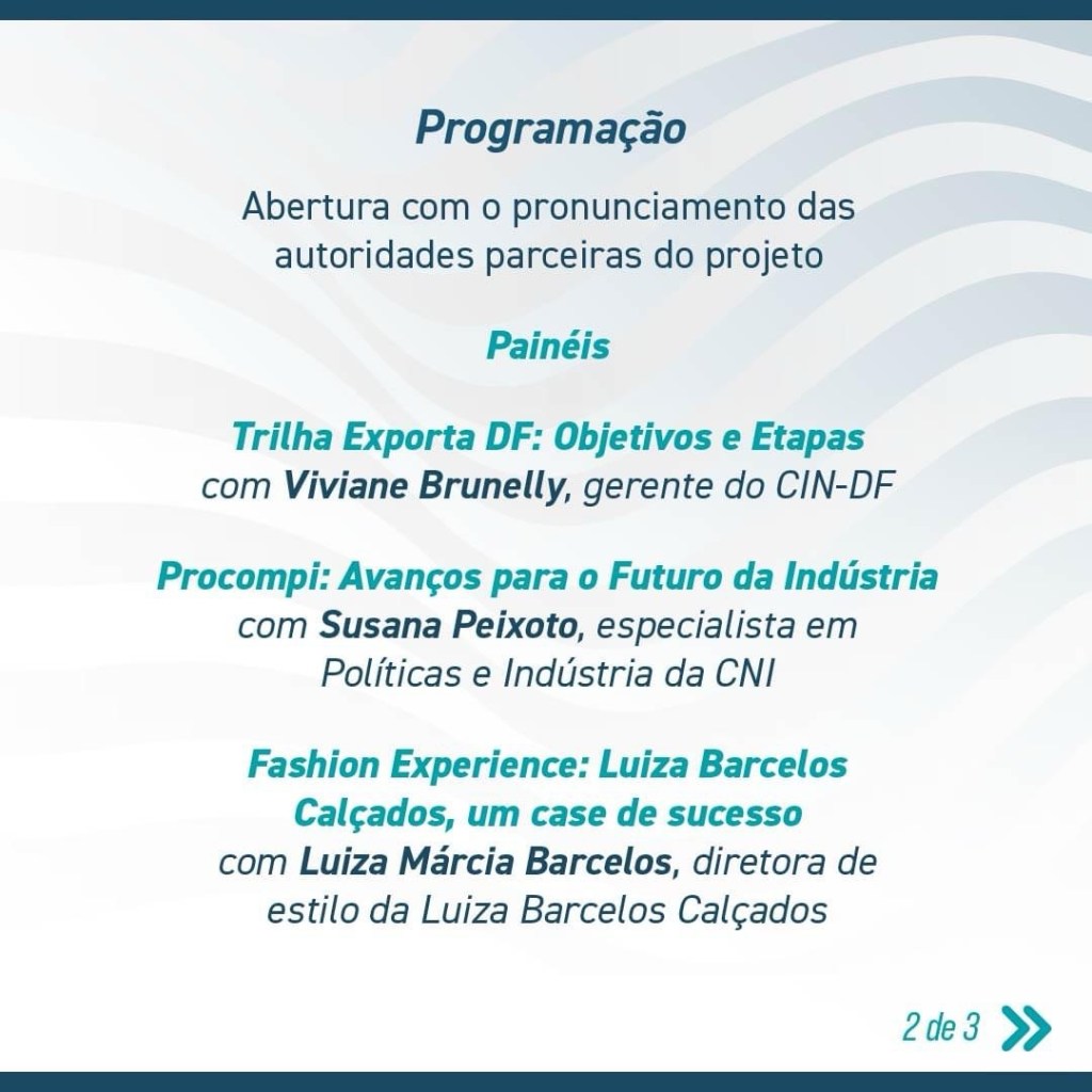 Serão apresentados dois painéis. O primeiro vai detalhar a trilha do Exporta DF e o segundo será sobre o Programa de Apoio à Competitividade das Micros e Pequenas Indústrias (Procompi), iniciativa da CNI e do Sebrae focada na promoção da inovação e no aumento da produtividade de micro e pequenas empresas do setor industrial.