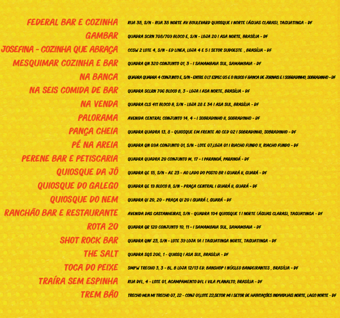 • Quiosque da Jô – QE 15, S/N – AE 23 – Ao lado do posto BR | GUARÁ II