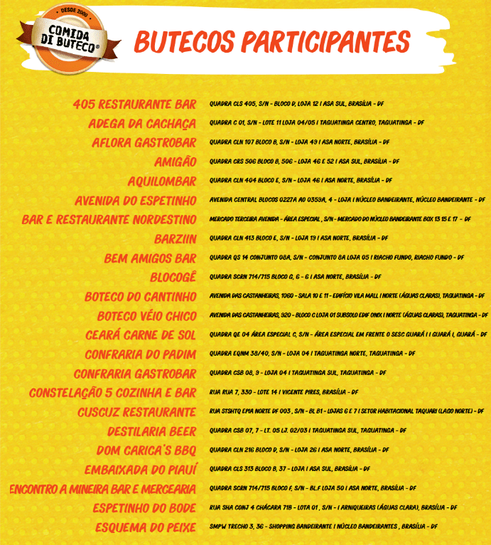 A primeira etapa é regional onde a votação é feita pelo público e jurados da própria cidade. A divulgação do resultado e a premiação em Brasília está prevista para 15 de maio.  Depois de eleitos os campeões de cada circuito, um outro corpo de jurados visita e avalia os campeões para que seja eleito então, o MELHOR BUTECO DO BRASIL. Em julho, numa festa realizada em São Paulo é revelado o buteco campeão. Confira a lista dos butecos participantes e petiscos no site: https://comidadibuteco.com.br/