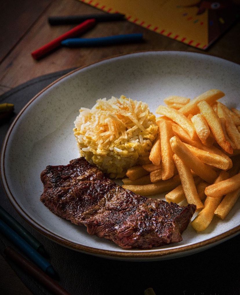 O menu kids oferece duas opções: o Prato Kids (R$ 32), com paillard, arroz branco, feijão e purê de batata ou fritas, e, para os pais que desejam variar um pouco, há também um sanduíche, o X-Burger Kids (R$ 29), montado com pão, carne e queijo cheddar.