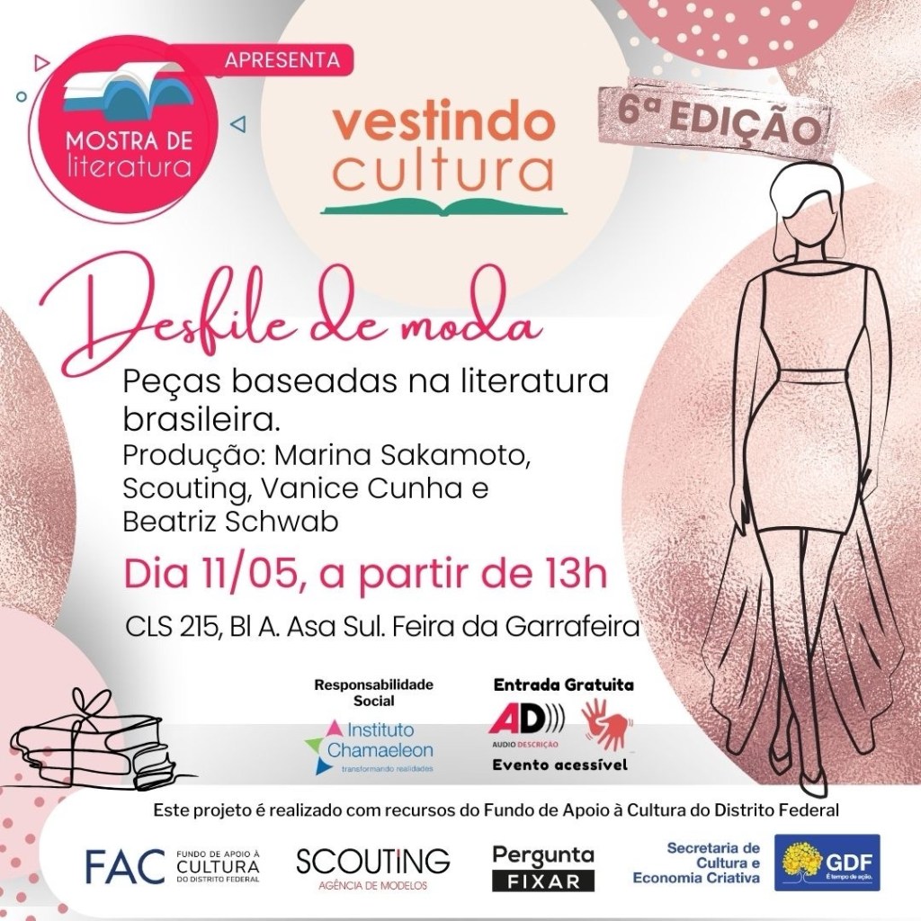 Está chegando mais uma edição do VestindoCultura – uma iniciativa que une diversas expressões culturais — como literatura, artesanato e fotografia — com o universo da moda, visando enriquecer o cenário cultural da região. Este ano o projeto começa com um desfile de moda, no dia 11 de maio, a partir de 13h, na Feira da Garrafeira (215 sul).