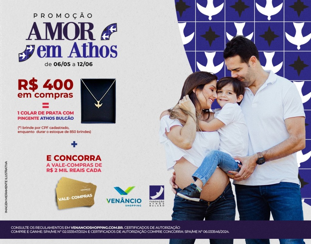 A campanha “Amor em Athos” é uma homenagem ao renomado artista brasileiro Athos Bulcão. A ação dupla celebra o Dia das Mães e o Dia dos Namorados com brinde especial e sorteio. Durante o período de 6 de maio a 12 de junho, os clientes que realizarem compras no valor de R$ 400 ganham um colar de prata Athos Bulcão, válido enquanto durar o estoque de 850 brindes. Além disso, cada compra válida também dará ao participante a chance de concorrer a vale-compras no valor de R$ 2 mil reais. Compras aos finais de semana geram cupons em dobro. Para retirar o brinde instantâneo, os clientes podem se dirigir ao balcão de informações no piso térreo do shopping. O sorteio de 4 vale-compras será realizado às 11h, do dia 13 de junho de 2024. Para mais informações consulte o regulamento no site https://www.venancioshopping.com.br/