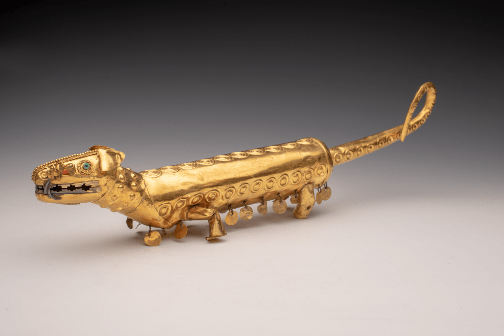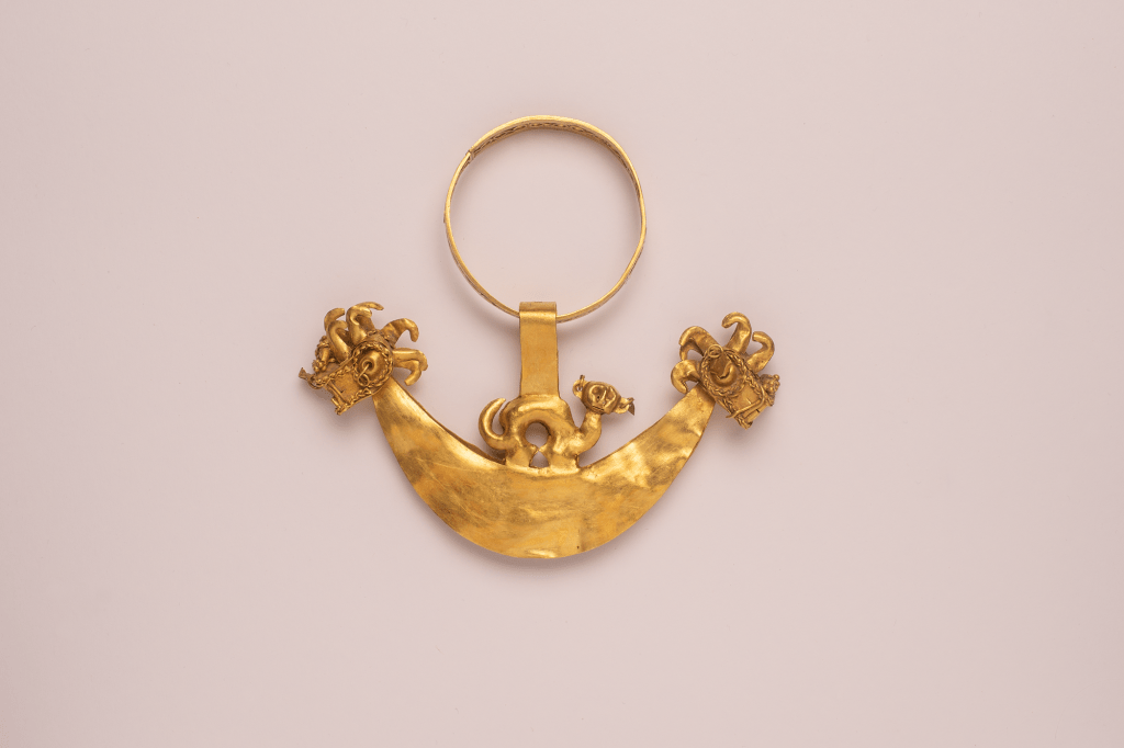 Objeto constituía parte de um conjunto funerário. Ouro.