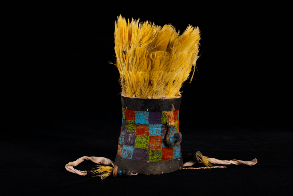 A armação é feita de uma estrutura de cana que foi coberta com um tecido de algodão. A parte externa é decorada com penas turquesa, amarela, roxa e vermelha. Elas têm um design suspenso e, na parte inferior, há duas fitas de algodão que são usadas para prendê-las à cabeça. Penas, algodão.